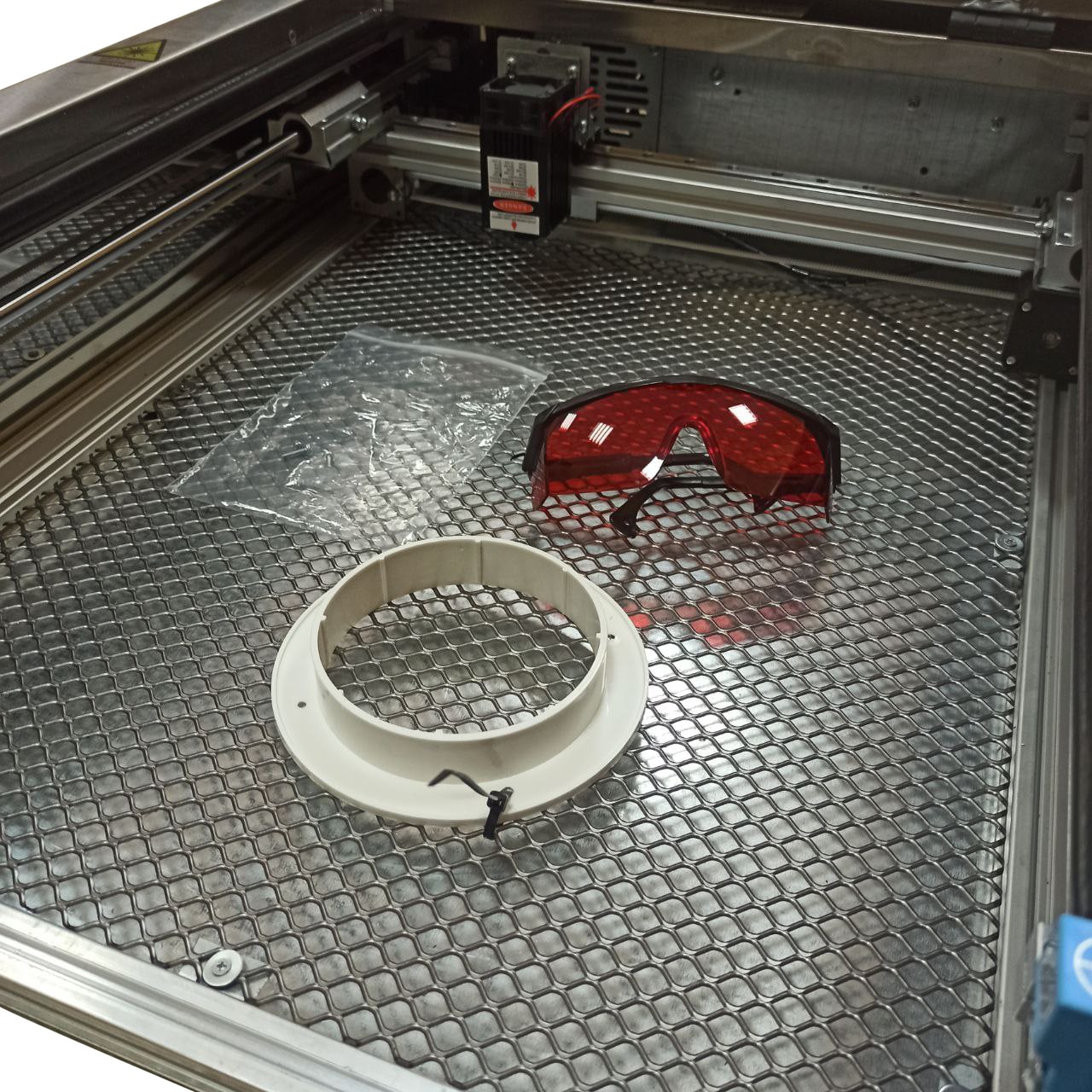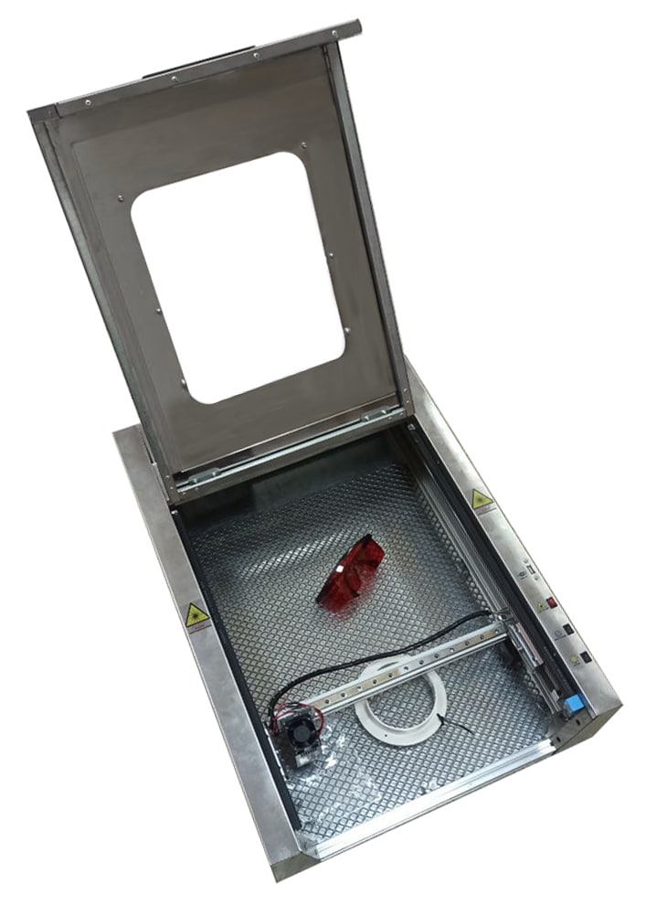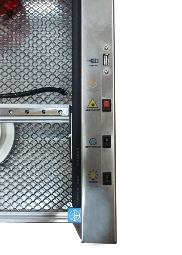 Встановлено індуктивний датчик відкривання захисних дверцят. Що унеможливлює потрапляння сторонніх предметів, а також частин тіла під дію лазерного випромінювання під час роботи станка. Це забезпечує безпечну роботу пристрою.