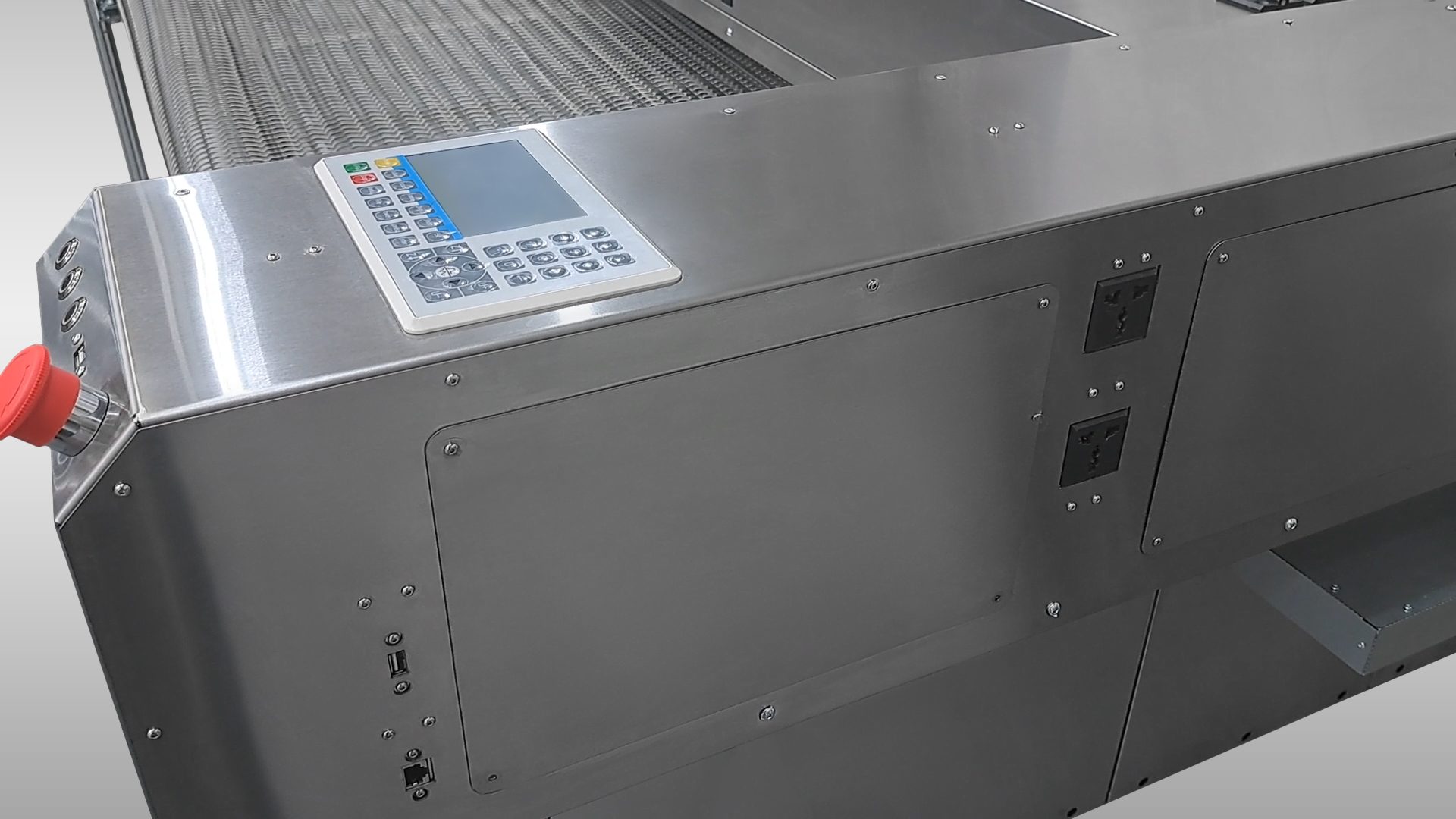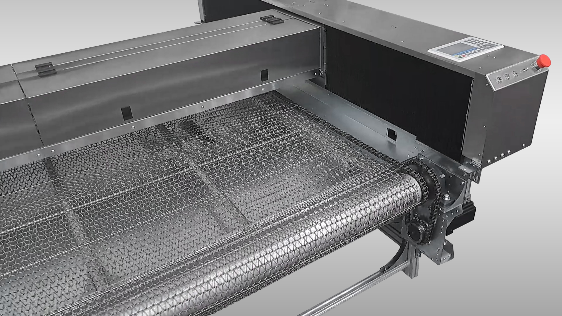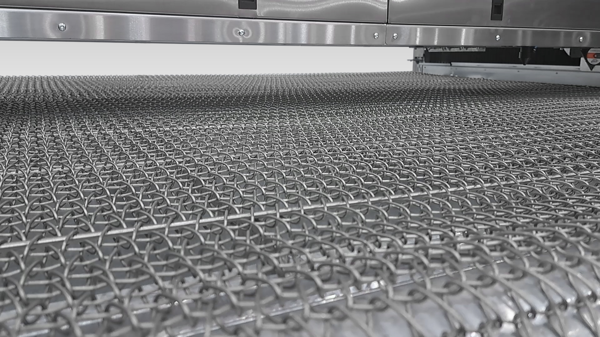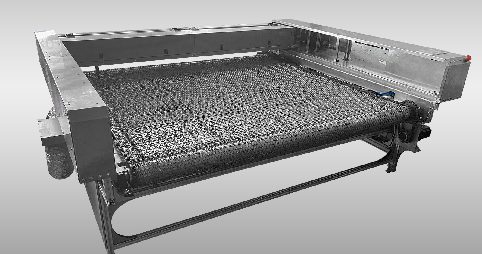 Поле виконано з нержавіючою сталі, що забезпечує його довговічність. Подача сітки виконана металевим ланцюгом , що встановлений по краях сітки. Також сама сітка армована коленими каліброваними  валами 5мм, це забезпечує рівномірний рух сітки по полю без «провисань», перекручувань, «прокруток» – на відміну від китайських аналогів. Рух сітки по полю та під ним виконаний по напрямним виконаним з нержавіючої сталі – це забезпечує довговічність і надійність конструкції. Для приведення руху встановлено кроковий двигун з планетарним редуктором – ви можете регулювати швидкість руху поля. Також забезпечується висока точність переміщення поля.